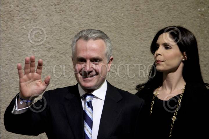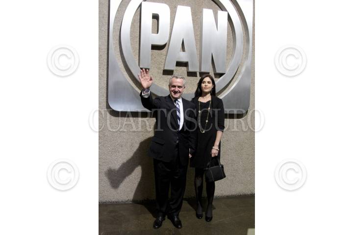MÉXICO, D.F., 31ENERO2012.- Santiago Creel Miranda, precandidato a la Presidencia de la República, y su esposa Paulina Velasco, llegaron a la sede del PAN en donde se realizó el segundo debate con sus adversarios políticos Josefina Vázquez y Ernesto Cordero, en busca de la candidatura de partido blanquiazul. FOTO: ENRIQUE ORDÓÑEZ/CUARTOSCURO.COM