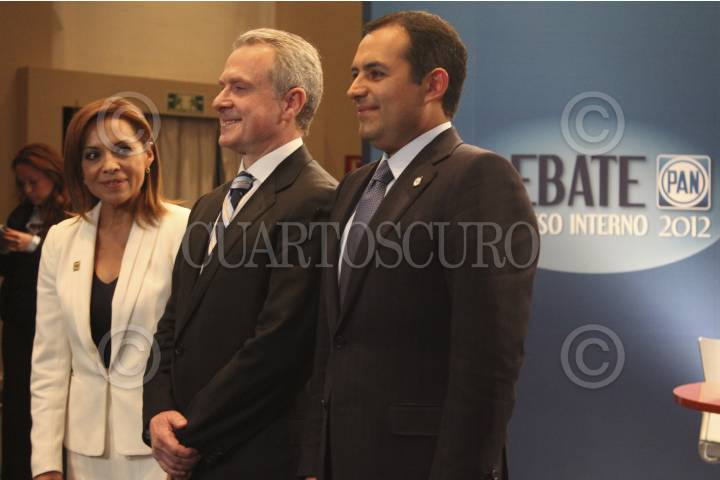 MÉXICO, D.F., 31ENERO2012.- Josefina Vazquez Mota junto a Santiago Creel Miranda y Ernesto Cordero Arroyo, precandidatos a la presidencia de la republica por el PAN minutos antes del debate que matuvieron en miras a las elecciones internas de su parido para elegir a su cadidato. FOTO: ENRIQUE ORDÓÑEZ/CUARTOSCURO.COM