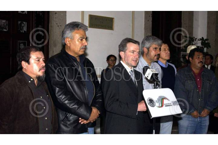 El secretario de Gobernación, Santiago Creel Miranda, se reunió esta tarde con las organizaciones campesinas que integran el Congreso Agrario Permanente y anunciaron que será el próximo jueves cuando se instalen las mesas de dialogo entre el Gobierno Federal y dichas organizaciones para lograr una acuerdo nacional para el campo. FOTO: Alberto Valdéz/CUARTOSCURO.COM