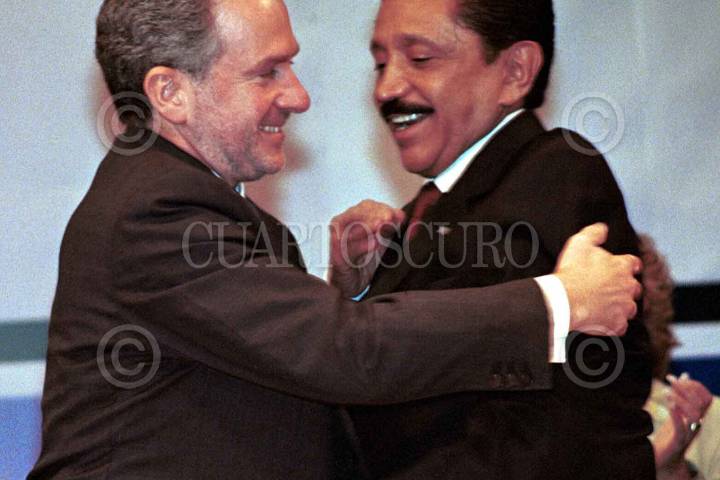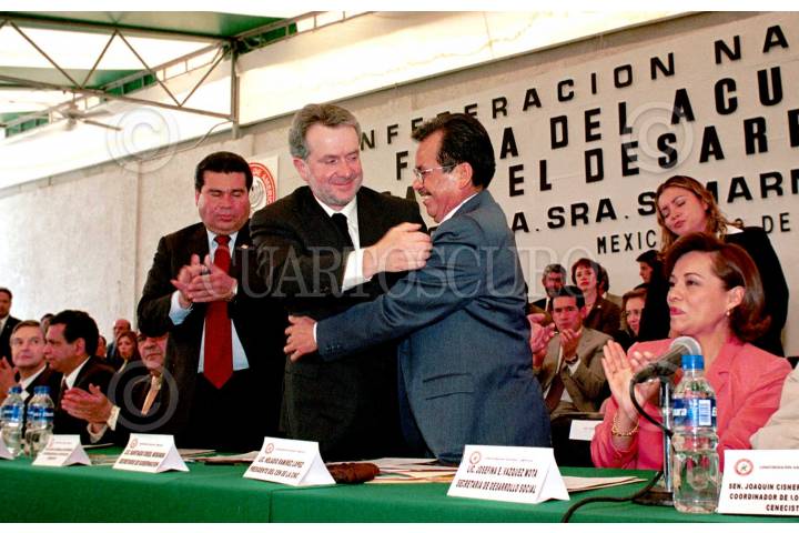 Santiago Creel Miranda, secretario de Gobernación abraza a Heladio Ramírez dirigente de la C.N.C., después de la Firma del Acuerdo Político para el Desarrollo Nacional. FOTO: Victoria Valtierra/CUARTOSCURO.COM