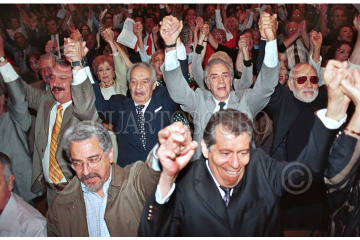 Miembros de la ANDA al término de interpretar el himno de dicha asociación en la firma del acuerdo del Secretario de Gobernación Santiago Creel y Juan Imperio,Secretario General de la ANDA, para denunciar a los actores que trabajen en territorio nacional de forma irregular. FOTO: Sandra Perdomo/CUARTOSCURO.COM