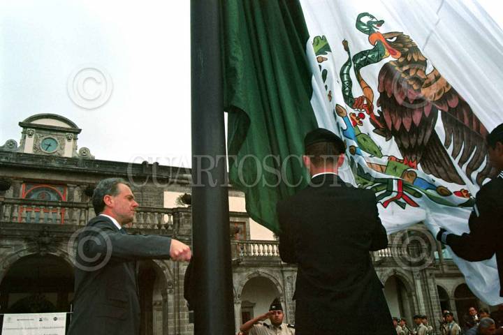 El secretario de Gobernación Santiago Creel iza la bandera en el castillo de Chapultepec, durante la ceremonia de la toma de protesta de la ¨asociación de amigos y fundación Pro Museo de Historia del castillo¨. FOTO: Moisés Pablo/CUARTOSCURO.COM