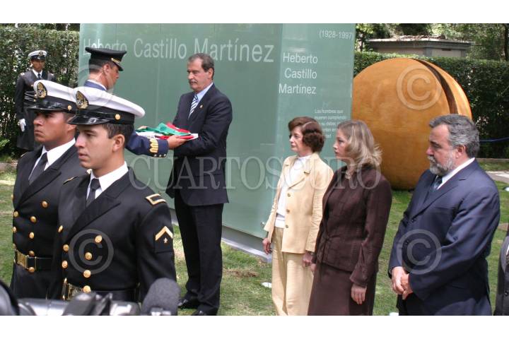 México, D.F. 05 ABRIL 2004.- Vicente Fox recibe la bandera nacional luego del traslado de la urna de Heberto Castillo al monumento, en la rotonda de los hombres ilustres en el panteón Dolores. FOTO: Sandra Perdomo/CUARTOSCURO.COM