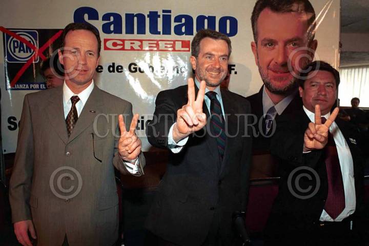 El candidato panista a la gubernatura del Distrito Fedral, Santiago Creel (centro) durante la conferencia en la que anunció la adhesión de cuarenta candidatos de la Nueva Repubica a su campaña.