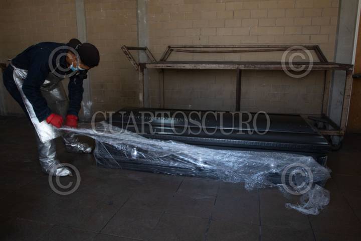 El trabajador Marco Baltazar retiró el plástico protector de un féretro antes de ser incinerado en el Crematorio municipal Nezahualcóyotl