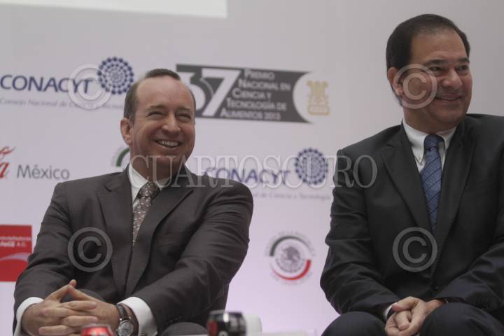 MÉXICO, D.F., 13NOVIEMBRE2013.- Francisco Crespo, presidente de la Coca Cola México y Fernando Ponce Díaz, presidente del consejo directivo de la Asociación de Embotelladoras México de Coca Cola, en la entrega del Premio Nacional de Ciencia y Tecnología en Alimentos en la vieja casona de Xicotencatl. FOTO: CUARTOSCURO.COM
