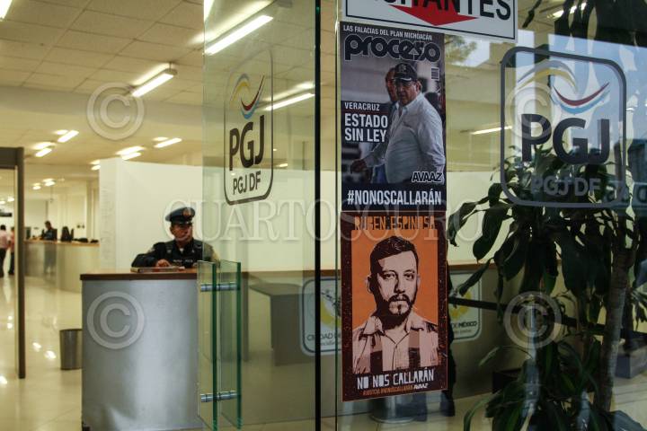MÉXICO, D.F., 01OCTUBRE2015.- A 60 días del multihomicidio de la colonia Narvarte la Procuraduría General de Justicia del Distrito Federal (PGJDF), mantiene la teoría de un “ajuste de cuentas” de narcotraficantes con la víctima de nacionalidad colombiana Mile Virginia Martín. Cinco jóvenes acudieron a las instalaciones de dicha institución y pegaron en la infraestructura retratos de las victimas junto con la portada de la revista Proceso como forma de protesta ante la falta de respuesta y aclaración de los hechos de parte de las autoridades. FOTO: ISABEL MATEOS /CUARTOSCURO.COM