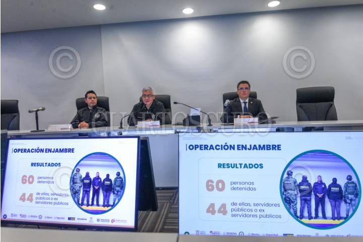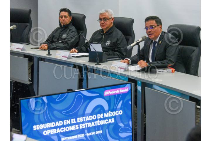TOLUCA, ESTADO DE MÉXICO, 14MAYO2025.- Cristóbal Castañeda Camarillo, Secretario de Seguridad en el Estado de México, acompañado por Fernando Díaz Juárez, presidente del Poder Judicial del Estado de México y Martín Marín Colín, Vicefiscal General de la FGJEM, en conferencia de prensa informó sobre los avances en materia de seguridad estatal a través de las diferentes Operaciones Estratégicas que se han implementados en la entidad mexiquense; con Enjambre, Bastión, Atarraya y Fortaleza, que se llevan a cabo con autoridades federales para combatir el crimen organizado y la delincuencia, se ha logrado disminuir un 33 por ciento en los delitos de alto impacto y afirmó que llegaron para quedarse. FOTO: CRISANTA ESPINOSA AGUILAR /CUARTOSCURO.COM