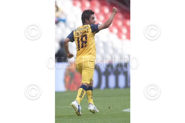 MÉXICO, D.F., 14ABRIL2012.- El jugador del America, Cristian "El Hobbit" Bermúdez, anotó el primero de tres goles con los que las Aguilas vencieron a los Santos Laguna en un global de 3 goles a 1. Con esto, el equipo de Coapa llegó a 28 puntos acercandose a los punteros. FOTO: FRANCISCO RODRÍGUEZ /CUARTOSCURO.COM