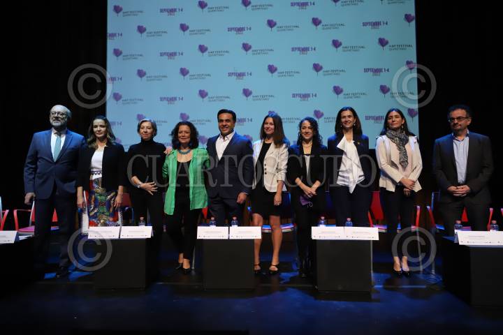 CIUDAD DE MÉXICO, 10JUNIO2025.- Izara García Rodríguez, coordinadora internacional del Hay Festival; Susannah Goshko, embajadora británica en México; Juan Duarte Cuadrado, embajador de España en México; Daniela Salgado Márquez, secretaria de Cultura del Municipio de Querétaro, y Cristina Fuentes La Roche, directora internacional de Hay Festival, durante la presentación de la décima edición del "Hay Festival Querétaro" que se llevará a cabo del 4 al 7 de septiembre. El evento tuvo lugar en el Centro Cultural de España en México. FOTO: MARIO JASSO/CUARTOSCURO.COM