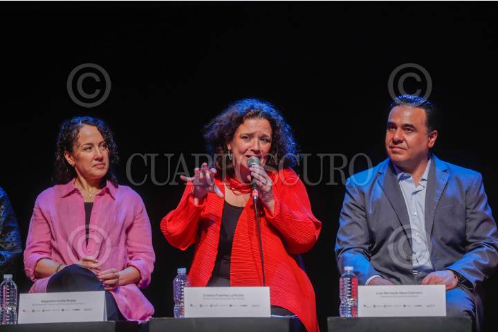 Alejandra Iturbe Rosas, secretaria de Turismo de Querétaro; Cristina Fuentes La Roche, directora del Hay Festival, y Luis Bernardo Nava, presidente municipal de Querétaro, en la conferencia de prensa del Hay Festival.