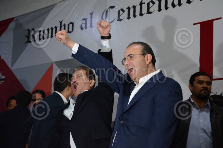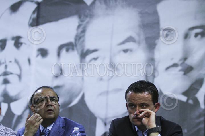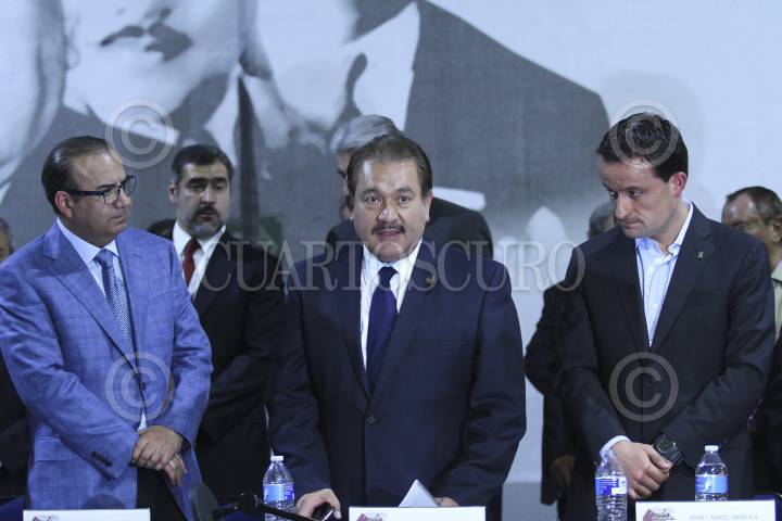 CIUDAD DE MÉXICO, 13MAYO2017.- Mikel Arriola Peñalosa, director general del Instituto Mexicano del Seguro Social (IMSS); Rodolfo González Gúzman, secretario general del CROM; Alfonso Navarrete Prida, secretario del trabajo y previsión social; Carlos Aceves del Olmo, secretario general de la Confederación de Trabajadores de México (CTM), durante la LXV Convención Nacional Ordinaria y XCIX Aniversario de la Fundación de la Confederación Regional Obrera Mexicana (CROM), en el marco del 99 aniversario de su creación. FOTO: MARIO JASSO /CUARTOSCURO.COM