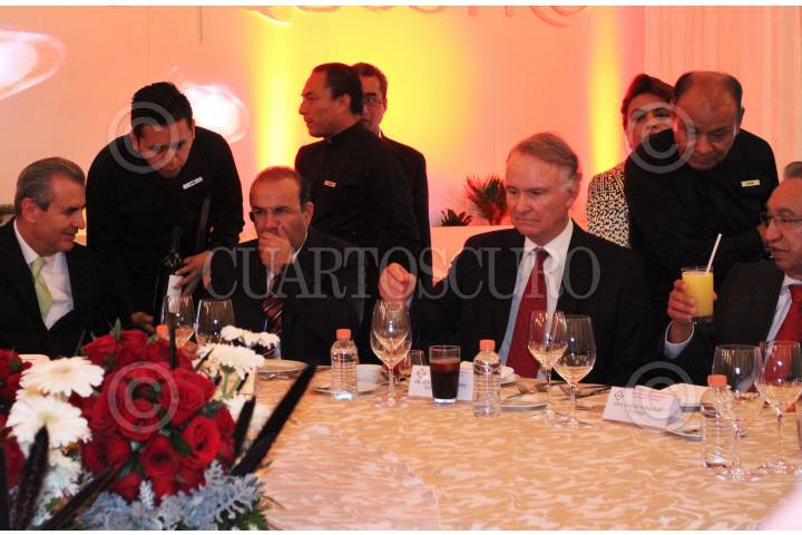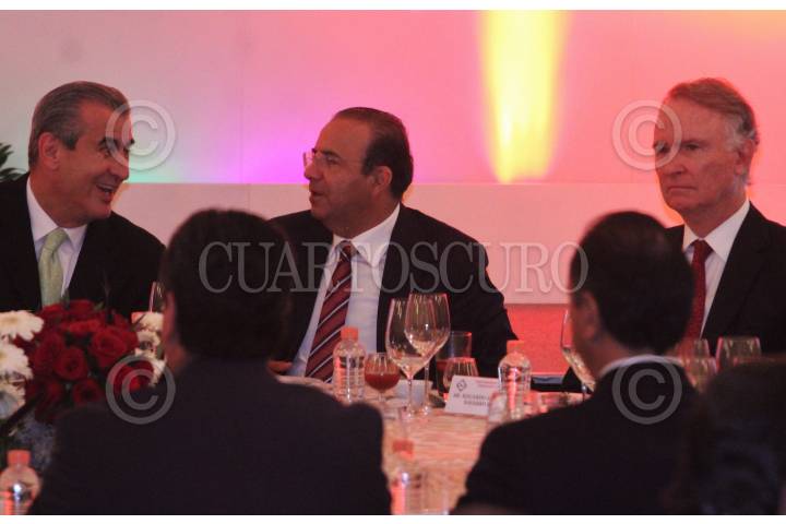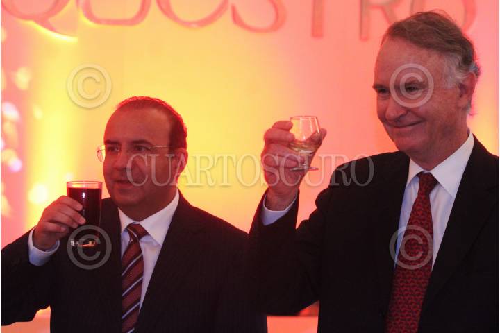 CIUDAD DE MÉXICO, 23SEPTIEMBRE2016.- En la imagen, Alonso Navarrete Prida, secretario de Trabajo, y Eduardo Sánchez Navarro, durante el brindis. Tras dos horas de retraso, Alfonso Navarrete Prida, secretario de Trabajo y Previsión Social (STPS), presidió el evento “Reconocimiento al Empresario que Invierte y Promueve Empleos en México”, auspiciado por la CROM. Tuvo que abandonar el evento debido a que se encontraba enfermo de la garganta. FOTO: MARÍA JOSÉ MARTÍNEZ /CUARTOSCURO.COM