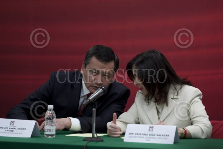 MÉXICO, D.F., 18ENERO2012.- Miguel Osorio Chong y Crsitina Díaz, secretaria general del PRI durante una conferencia de prensa que ofreció Enrique Peña Nieto, candidato a la presidencia de la República que se realizo este medio día en el CEN del PRI. FOTO: RODOLFO ANGULO/CUARTOSCURO.COM