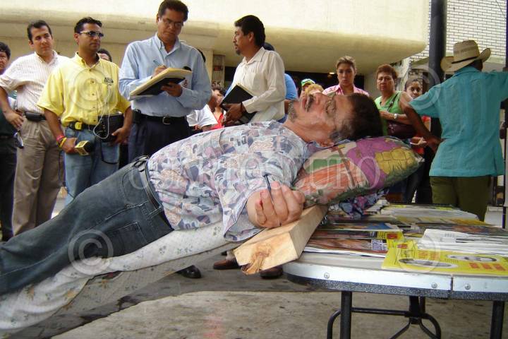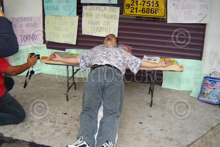 VERACRUZ, VER. 5 de Junio de 2006.- El ex empleado de Zofemat Sergio Manuel Vargas Montero se crusificó a una "cruz" a dos cuadras del Palacio Municipal como protesta porque están destruyendo los manglares de Mandinga para construir un fraccionamiento denominado "El Dorado", además la destrucción de otros escositemas de la biosfera en el mundo y aseguró no quitarse de ahí hasta que su cuerpo aguante ya que también estará en huelga de hambre. FOTO: EVAGURA/CUARTOSCURO.COM
