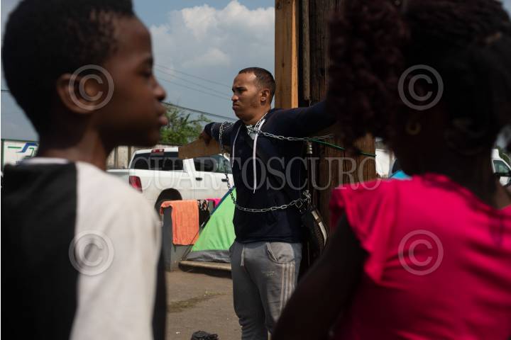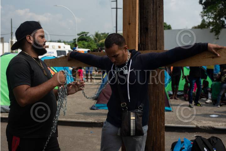 TAPACHULA, CHIAPAS, 07ABRIL2019.- Denis Hernandez, quien mantiene una huelga de hable desde hace 10 días, realizó una manifestación en día de hoy en las inmediaciones de la Estación Migratoria Siglo XXI, simulando una crucifixión en contra de las deportaciones que se han realizado los últimos días. FOTO: ISABEL MATEOS /CUARTOSCURO.COM