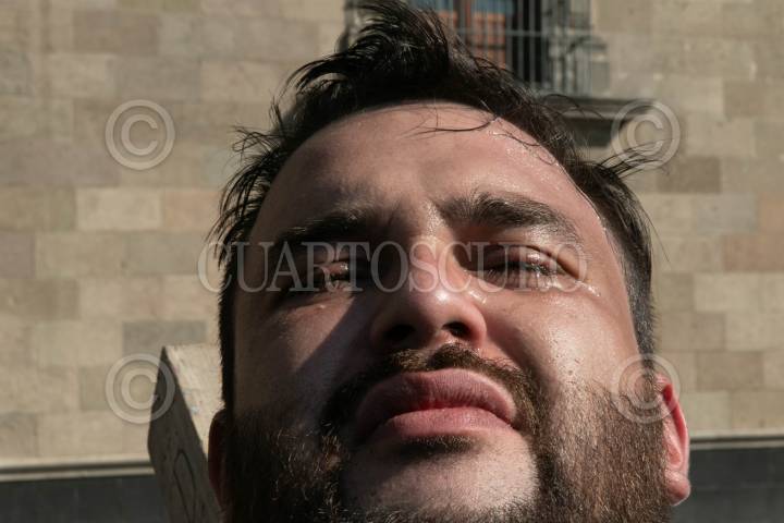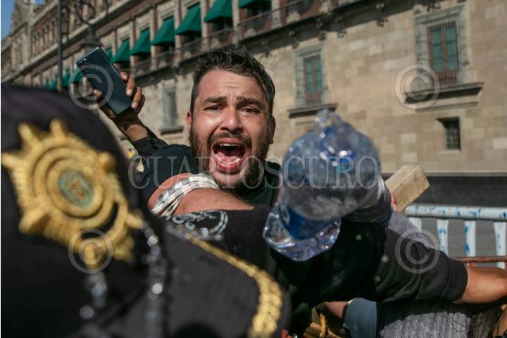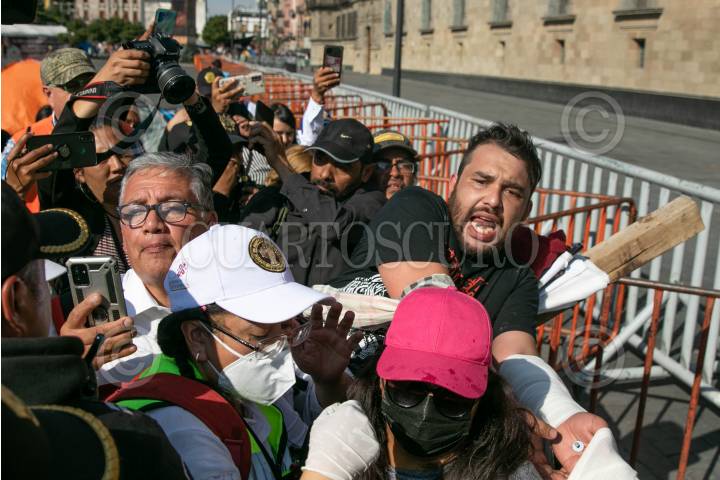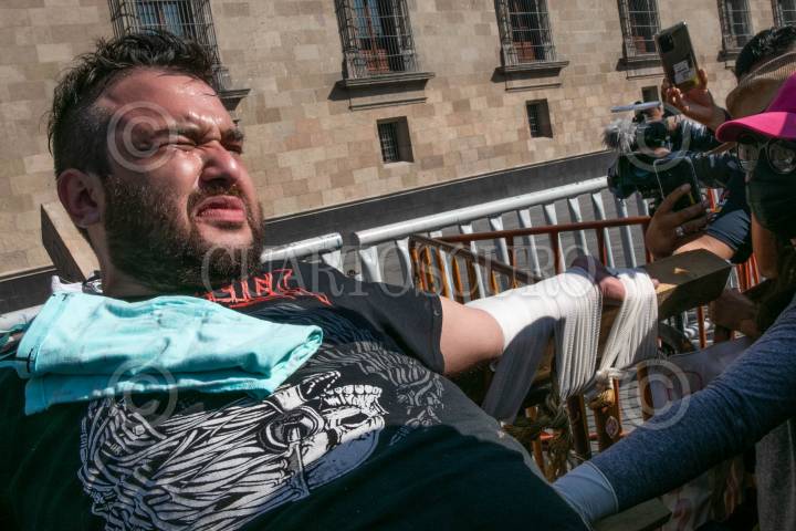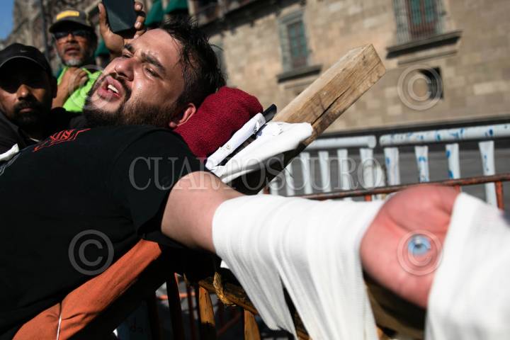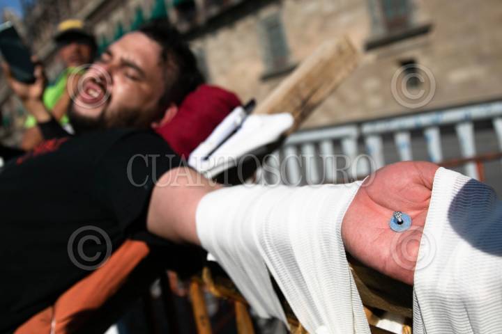 CIUDAD DE MÉXICO, 07NOVIEMBRE2023.- Óscar Kábata, víctima de violaciones a sus derechos por parte de miembros del Ejército y testigo del asesinato de su amigo, se crucifico frente a Palacio Nacional, en la cual grito que el Presidente de México, Andrés Manuel López Obrador, le había fallado a las promesas de reparación del daño. La víctima venía acompañado de varias mujeres que también han sufrido violencia y que actualmente están en campamento afuera de la Secretaría de Gobernación, ahí denunciaron que han sido constantemente hostigado por parte de funcionarios de esa dependencia. FOTO: MOISÉS PABLO/CUARTOSCURO.COM