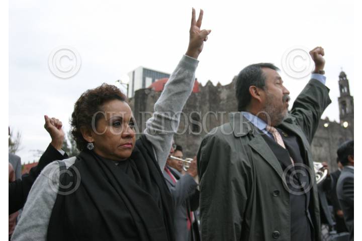 MEXICO,D.F.,02OCTUBRE2007.- En la plaza de la Tres Culturas en Tlatelolco se realizó un evento conmemorativo por el 02 octubre, por parte del Gobierno del Distrito Federal en donde asistió Martí Batres, secretario de Desarrollo Social, José Muñoz Soria, delegado de la Cuahtémoc y Salvador Martínez De lla Rocca conocido como el "El pino". En la imagen, participantes del evento. FOTO:ROCIO ORTIZ/CUARTOSCURO.COM