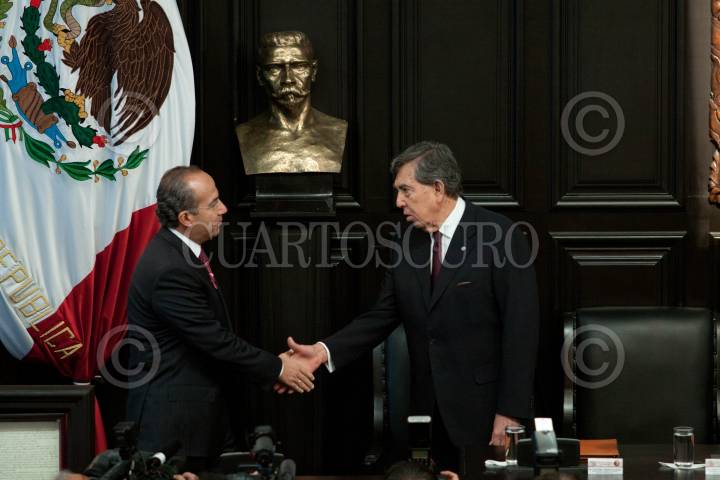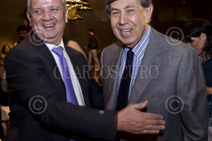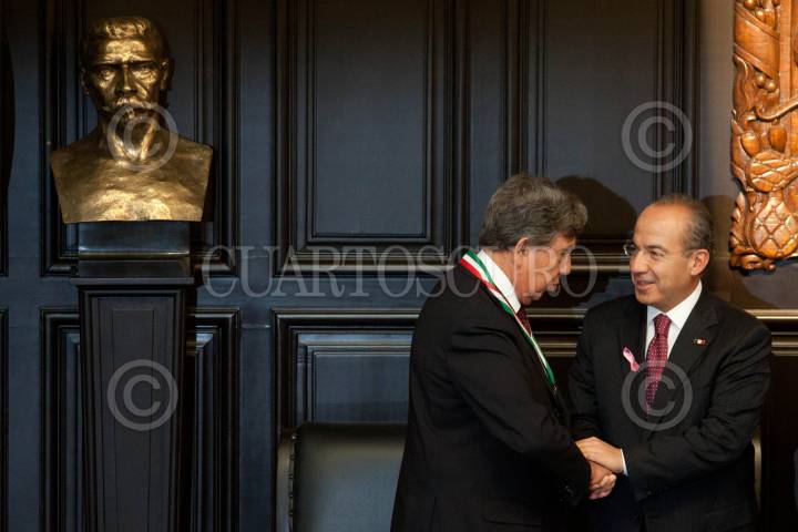 MÉXICO, D.F., 27OCTUBRE2011.- Felipe Calderón Hinojosa, Presidente de México, saludó a Cuahtémoc Cárdenas Solorzano, quien recibió la medalla Belisario Domínguez que entrega el Senado de la República. La ceremonia fue realizada en la antigua casona de la calle de Xicotencatl en el centro histórico. FOTO: MOISÉS PABLO/CUARTOSCURO.COM
