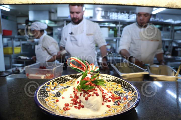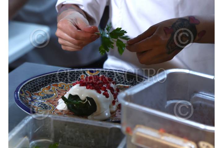 CIUDAD DE MÉXICO, 16AGOSTO2024. Chefs del restaurante Azulísimo preparan el tradicional chile en Nogada como parte de la presentación del cuarto Festival de Chiles en Nogada del Centro Histórico; en el cual participan 80 restaurantes del primer cuadro de la ciudad, que ofrecen el tradicional platillo, del 16 de agosto al 30 de septiembre. FOTO: EDGAR NEGRETE LIRA/CUARTOSCURO.COM