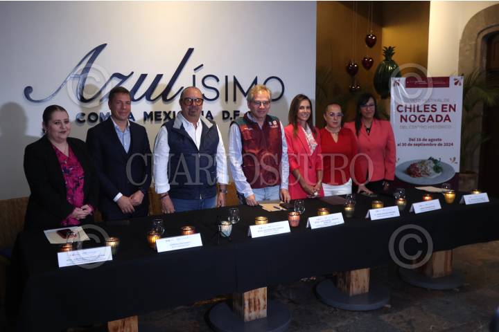CIUDAD DE MÉXICO, 16AGOSTO2024. Karla Leticia González Ruíz, directora general del instituto de promoción turística de la Secretaria de Turismo; Gonzalo Serrano, dueño del restaurante Azulísimo; Ricardo Ruíz Suárez, Secretario de gobierno de la CDMX, José Manuel Oropeza, coordinador general de la autoridad del Centro Histórico de la CDMX; Daniela Mijares Martínez, presidenta ejecutiva de la CANIRAC; María Fernanda Islas, empresaria del Centro Histórico y Yenefris Báez Alvarado, directora de a ministra pin y finanzas del fideicomiso del Centro Histórico durante la presentación del cuarto Festival de Chiles en Nogada del Centro Histórico; en el cual participan 80 restaurantes del primer cuadro de la ciudad, que ofrecen el tradicional platillo, del 16 de agosto al 30 de septiembre. FOTO: EDGAR NEGRETE LIRA/CUARTOSCURO.COM