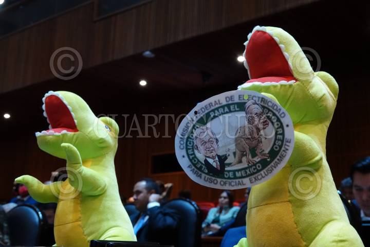 Dinosaurios que el diputado Mauricio Prieto entrego a Manuel Bartlett durante su comparecencia.