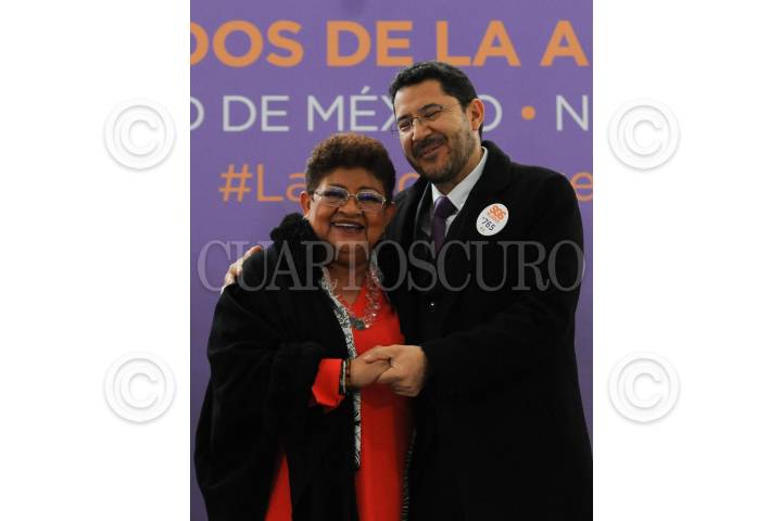 CIUDAD DE MÉXICO, 23NOVIEMBRE2023. - La fiscal capitalina, Ernestina Godoy es abrazada por el jefe de gobierno, Martí Batres, luego de su participación en el evento. FOTO: DANIEL AUGUSTO /CUARTOSCURO.COM
