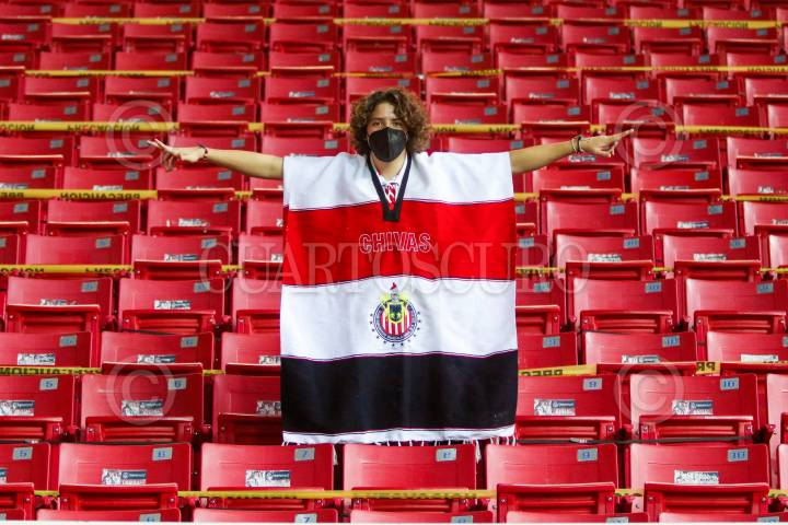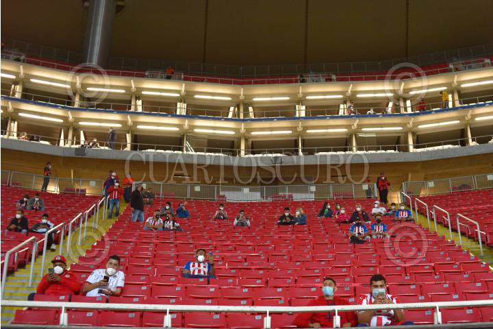 Seguidores de las Chivas durante el partido entre el Guadalajara y el América. La actividad en los estadios estaba restringida por la pandemia de Covid-19, sin embargo, autoridades del gobierno de Jalisco decidió que hubiera un aforo controlado.