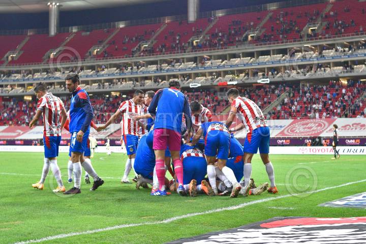 Las Chivas del Guadalajara celebran el gol de Cristian Calderón con el cual logaron la victoria por la mínima al América.
