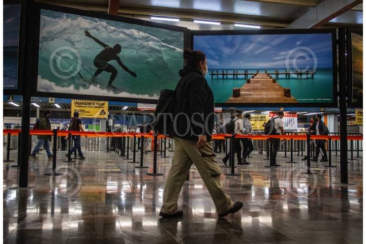 Pasajeros tiene que caminar por una unifila en la estación del metro Cuatro Caminos con la finalidad de evitar conglomeraciones al entrar a este transporte.
