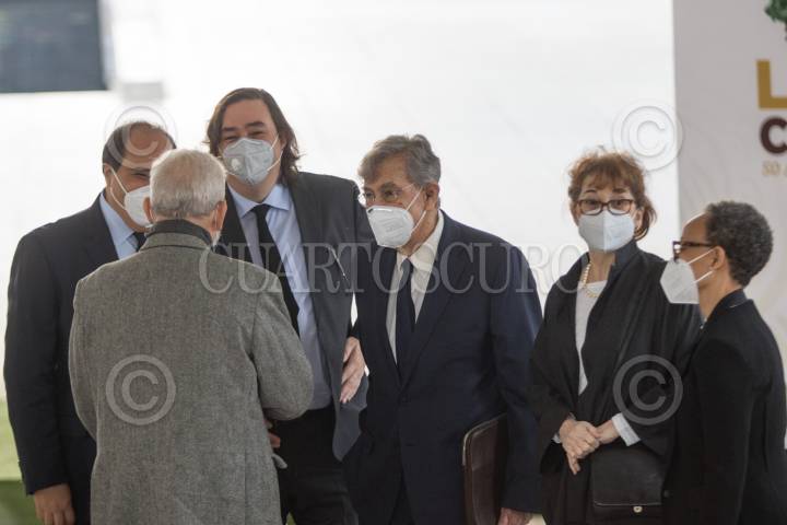 La familia Cárdenas Batel conversa con Jorge Arganis Díaz Leal, secretario de Comunicaciones y Transportes, durante el acto conmemorativo del 50 aniversario luctuoso del General Lázaro Cárdenas del Río, en el Monumento a Revolución.