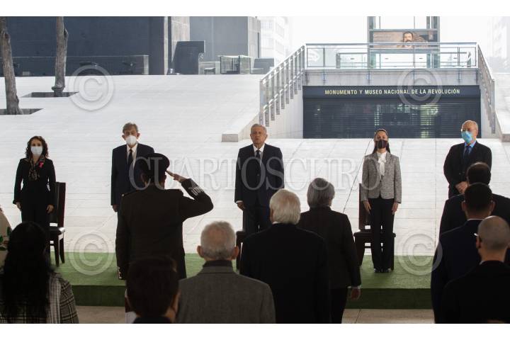 Dolores Padierna, vicepresidenta de la Cámara de Diputados; Cuauhtémoc Cárdenas Solórzano; Andrés Manuel López Obrador, Presidente de México; Claudia Sheinbaum Pardo, Jefa de Gobierno, y Lorenzo Meyer, durante el acto conmemorativo del 50 aniversario luctuoso del General Lázaro Cárdenas del Río, en el Monumento a Revolución.