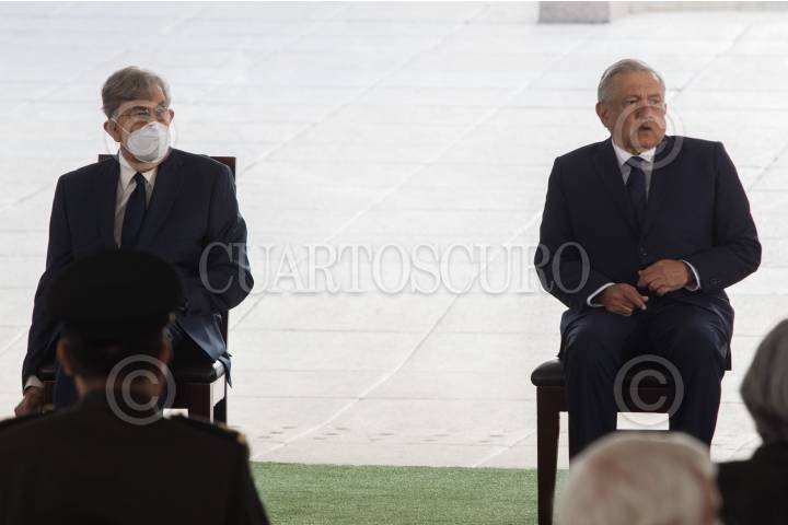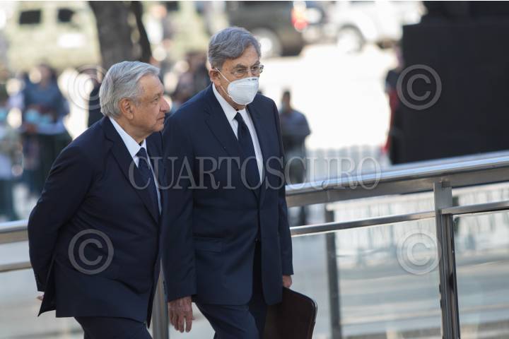 Cuauhtémoc Cárdenas Solórzano, hijo del ex Presidente Lázaro Cárdenas; y Andrés Manuel López Obrador, Presidente de México, durante el acto conmemorativo del 50 aniversario luctuoso del General Lázaro Cárdenas del Río, en el Monumento a Revolución.
