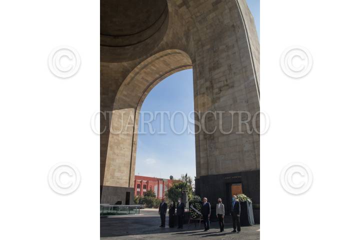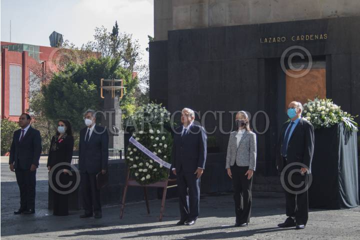 Eduardo Ramírez, presidente del Senado; Dolores Padierna, vicepresidenta de la Cámara de Diputados; Cuauhtémoc Cárdenas Solórzano; Andrés Manuel López Obrador, Presidente de México; Claudia Sheinbaum Pardo, Jefa de Gobierno; y el historiador Lorenzo Meyer, montan una guardia de honor afuera del mausoleo del Presidente Lázaro Cárdenas del Río, por su 50 Aniversario Luctuoso.