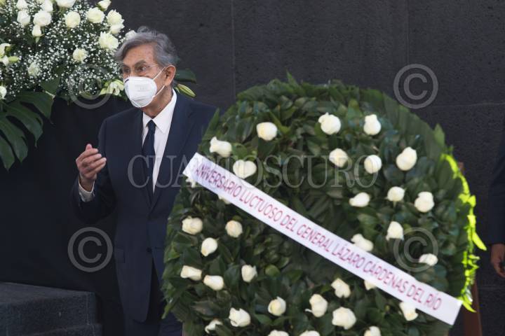 Cuauhtémoc Cárdenas Solórzano, hijo del Presidente Lázaro Cárdenas del Río, durante la ceremonia por su 50 Aniversario Luctuoso, en el Monumento a la Revolución.