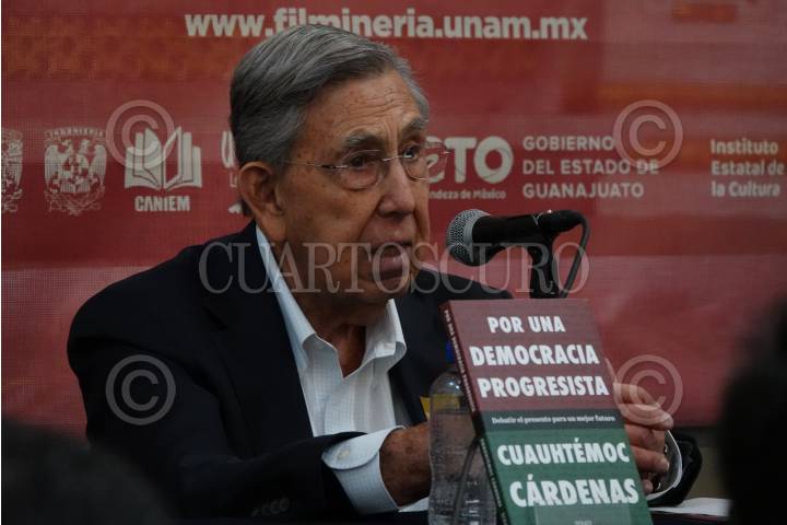 Cuauhtémoc Cárdenas Solórzano durante la presentación de su libro "Por una Democracia Progresista" en la 44 Feria Internacional del Libro del Palacio de Minería.