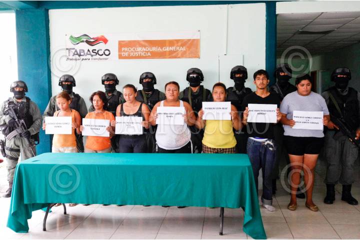 VILLAHERMOSA, TABASCO, 25JUNIO2010.- Dos peligrosas bandas de secuestradores de infantes fueron capturadas en los municipios de Nacajuxa y Cunduacan. Ambas bandas fueron presentadas en las instalaciones de la Policía Ministerial y están relacionadas con la celula delictiva "Zeta"; en la grafica la banda detenida en Cunducacan en donde seis son mujeres y un hombre. FOTO: MARCO POLO GUZMÁN HERNÁNDEZ/CUARTOSCURO.COM