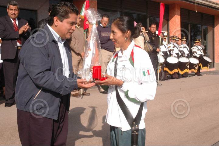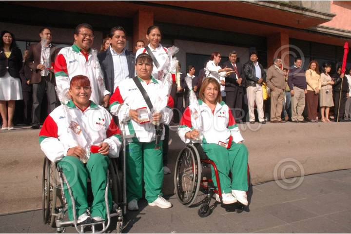 ECATEPEC, ESTADO DE MEXICO, 14JULIO2008.- El presidente municipal de Ecatepec, José Luis Gutiérrez Cureño, entregó la presea Siervo de la Nación y mil dólares para sus gastos en los Juegos Olímpicos de Beijin 2008 a los deportistas y atletas paraolímpicos ecatepenses participantes, tales como Patricia Retiz García, en 42 metros de atletismo; Jesús González, en los 50 kilómetros de marcha; Francisco Peláez en box, en la categoría de peso ligero de 60 kilogramos; Dora Elvia González Estrada y Adrián Paz Velásquez, en lanzamiento de bala, disco y jabalina, y las jugadoras de tenis de mesa María Teresa Arenales Huerta y María Paredes Albor. FOTO: MARIO NULO/CUARTOSCURO.COM