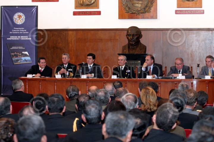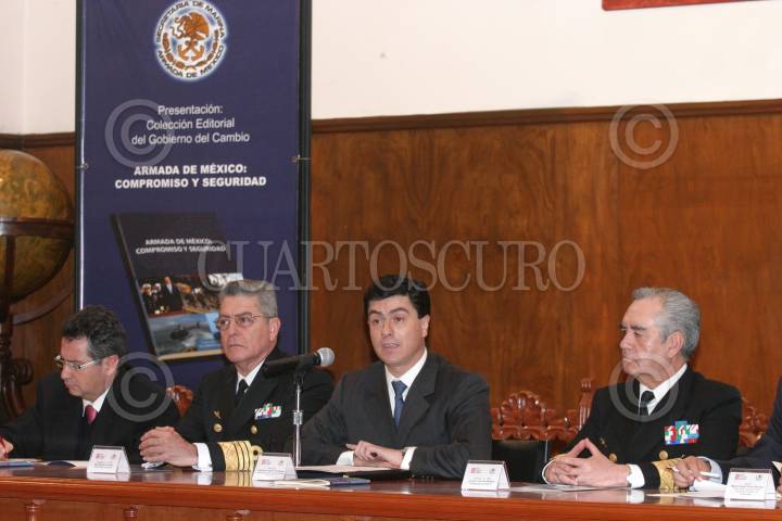 MEXICO, D.F., 10OCTUBRE2005.- Leonardo Curzio Gutierrez, peridista, Almirante Raúl Niembro Almazan, Geronimo Gutierrez Fernández, Titular de la Unidad de Enlace Federal de la Secretaría de Gobernación y el Almirante Armando Sanchez Moreno, Subsecretario de Marina, durante la presentación del libro Armada de México Compromisos y Seguridad, en las instalaciones de la Sociedad Méxicana de Geografía y Estadistíca. FOTO: Moisés Pablo/CUARTOSCURO.COM