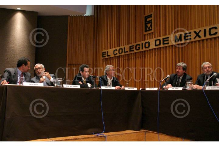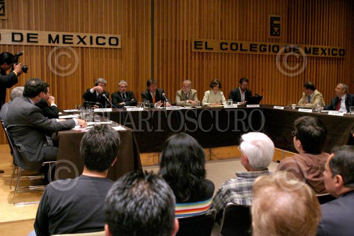 MEXICO, D.F., 20ABRIL2006.- Los intelectuales Sergio Aguayo, Miguel Angel Granados Chapa, Leonardo Curzio, Javier Solorzano, Roberto Rock y Jorge Alcocer, participaron en foro "2006, Año de Elecciones, Año de Reflexiones, en el Colegio de México. FOTO: Moisés Pablo/CUARTOSCURO.COM