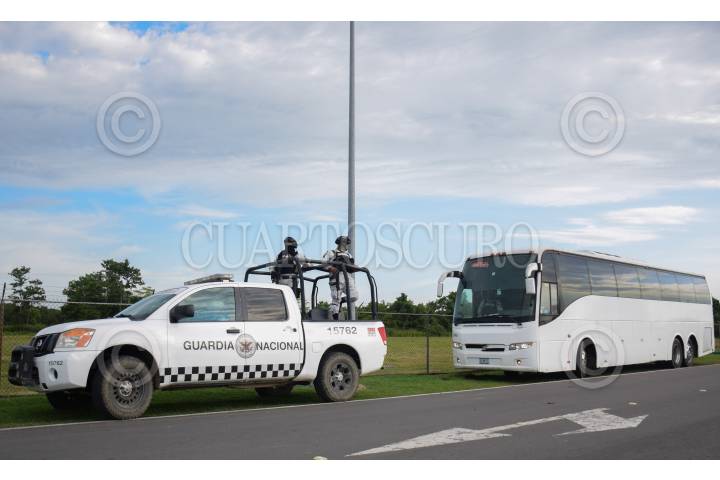 Integrantes de la Guardia Nacional custodian un camión con migrantes centroamericanos que fueron deportados de Estados Unidos.