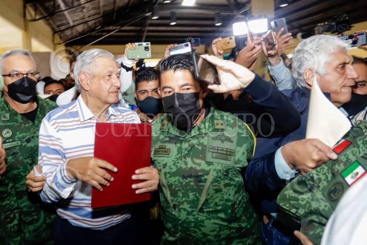 Damnificados por el paso del Huracán Grace en Huauchinango, Puebla, dieron portazo donde el Jefe del Ejecutivo, Andrés Manuel López Obrador, llevaba a cabo un evento en donde se analizaba el plan de apoyo a personas afectadas por este desastre natural, sin embargo los inconformes señalaron que a más de un mes de esto aún no han recibido ningún apoyo. En la imagen el mandatario sale custodiado por soldados.