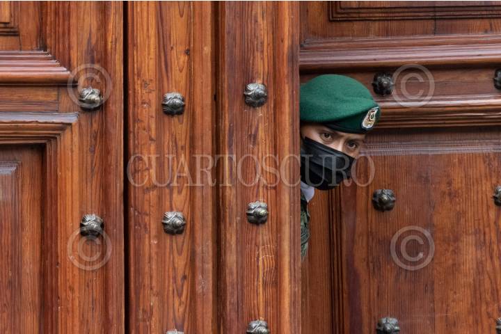 Un mujer de la Policía Militar resguarda una de las puertas de Palacio Nacionalo.