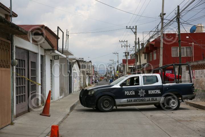 Elementos de la Policía Estatal resguardan la casa de seguridad en donde fueron liberadas 4 personas durante un operativo en la madrugada, relacionado con la detención de 7 personas presuntos integrantes del CJNG derivado de una persecución que terminó en la CDMX, dando como resultado 3 policías muertos.