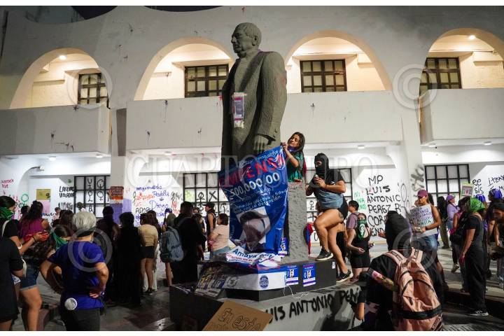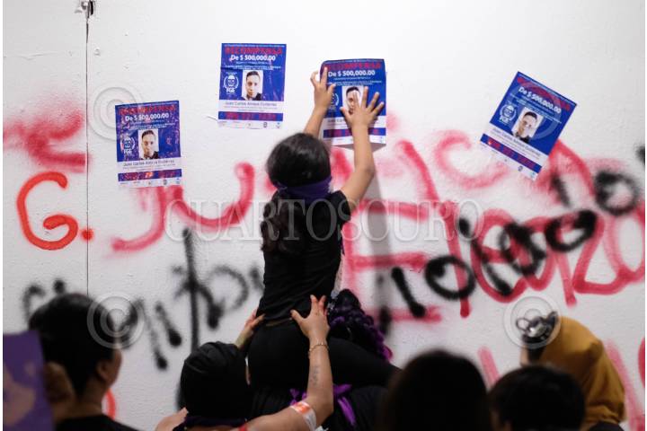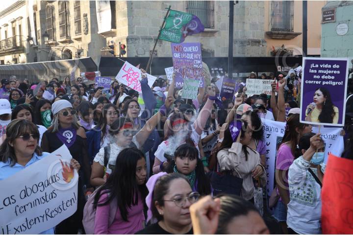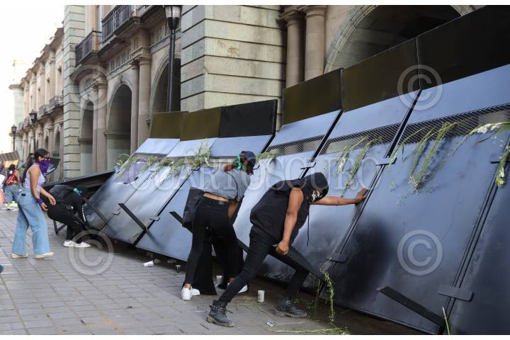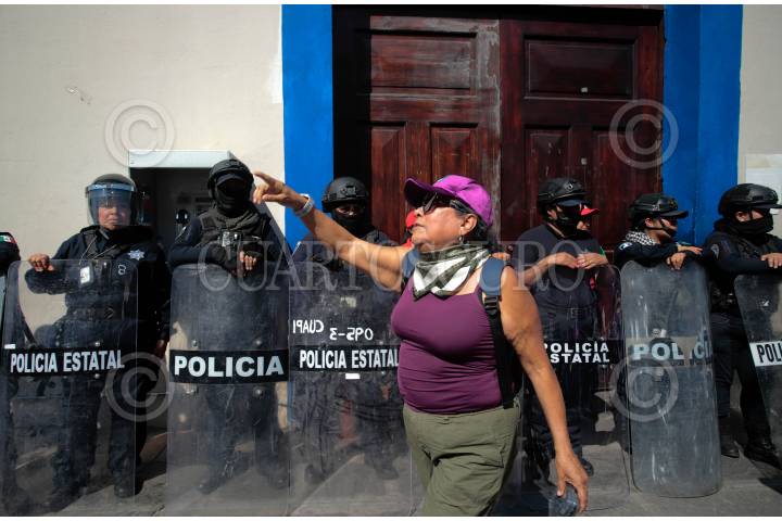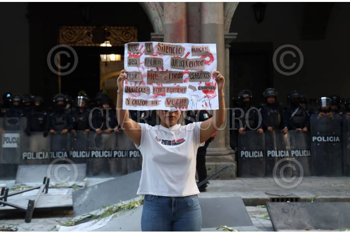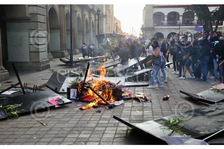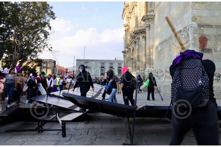 OAXACA DE JUÁREZ, OAXACA, 08MARZO2025.- Cientos de mujeres oaxaqueñas marcharon este 8 de marzo, Día Internacional de la Mujer, para exigir justicia y acciones al estado contra la violencia feminicida que ha cobrado la vida de 14 mujeres durante 2025 y 218 en lo que va de la administración del morenista Salomón Jara Cruz. Las manifestantes realizaron pintas y retiraron la vallas metálicas que habían sido instaladas en edificios públicos como la iglesia catedral y el Palacio de Gobierno. La manifestación fue dispersada con proyectiles de gas lacrimógeno disparados desde el Palacio de Gobierno.  FOTO: CAROLINA JIMÉNEZ MARISCAL/CUARTOSCURO.COM