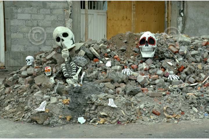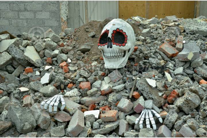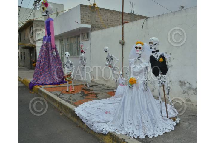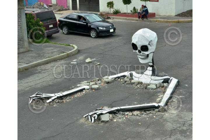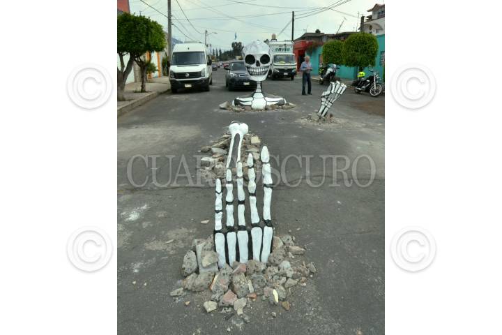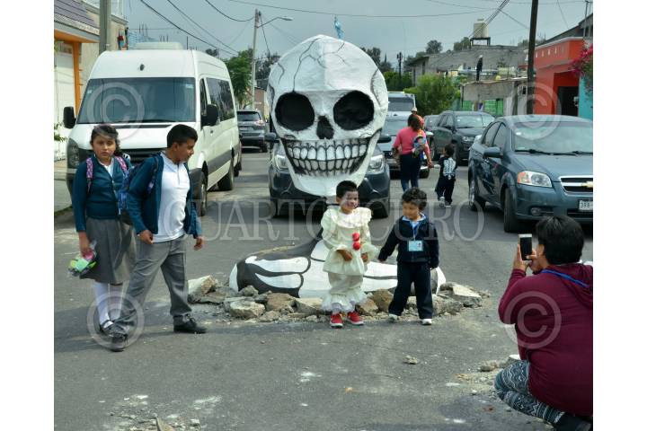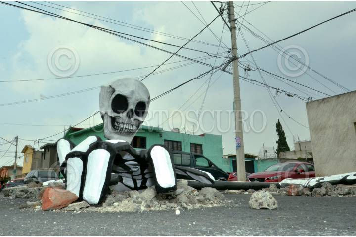 CIUDAD DE MÉXICO, 28OCTUBRE2019.- Los muertos emergieron del Mictlan y se instalaron a las afueras de domicilio de su creador Raymundo Medina. La calle Francisco Santiago Borra en la colonia Santa Cecilia se convirtió en la calle más visitada de la alcaldía Tláhuac, donde dos calaveras de dos y hasta cuatro metros acercan a los habitantes al tradicional Día de Muertos. FOTO: ARMANDO MONROY /CUARTOSCURO.COM