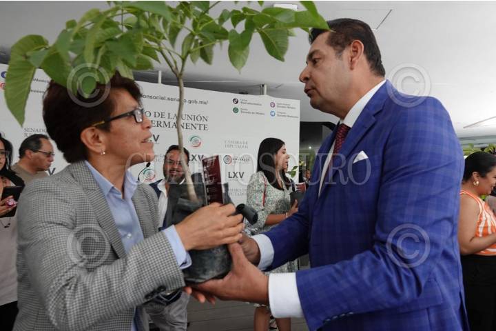 Alejandro Armenta, presidente de la mesa directiva en el Senado, entregó un nogal a Dorita, después de una conferencia de prensa en relación al Día del Árbol, realizada en el Patio del Federalismo