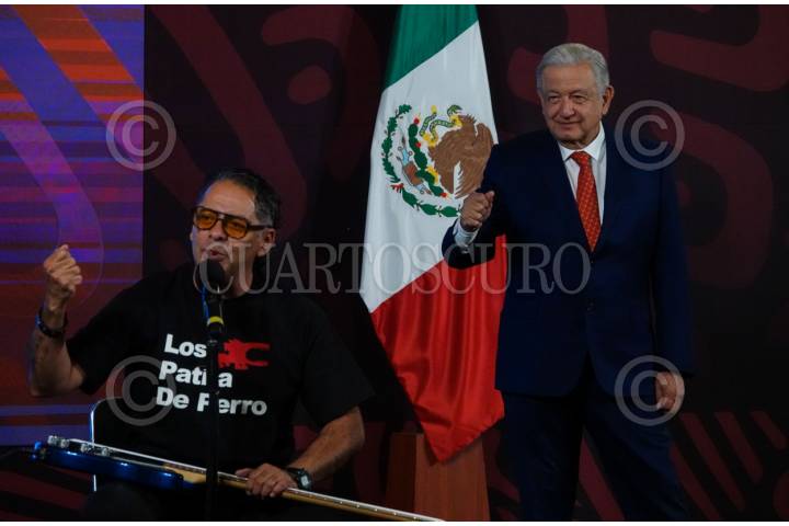 CIUDAD DE MÉXICO, 30ABRIL2024.- Previo al arranque del informe de seguridad en la conferencia matutina, el grupo de rock infantil “Los Patita de Perro” ofrecieron un pequeño concierto con motivo del Día de la Niñez para las asistentes a Palacio Nacional, así como para las infancias a lo largo del país. FOTO: GALO CAÑAS/CUARTOSCURO.COM
