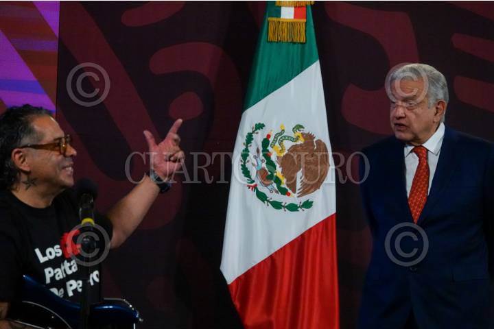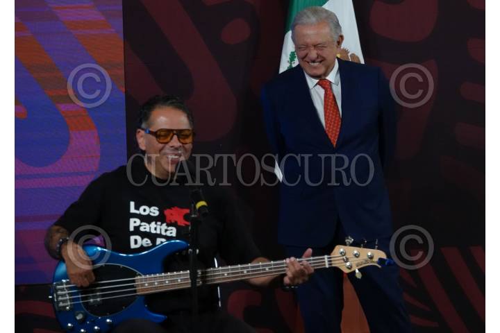 CIUDAD DE MÉXICO, 30ABRIL2024.- Andrés Manuel López Obrador, presidente de México, disfruta del pequeño concierto con motivo del Día de la Niñez ofrecido por el grupo de rock infantil “Los Patita de Perro”, Previo al arranque del informe de seguridad en la conferencia matutina. FOTO: GALO CAÑAS/CUARTOSCURO.COM