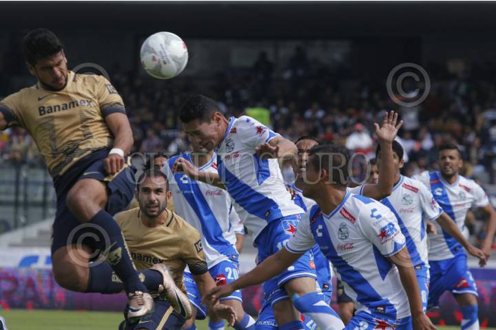 MÉXICO, D.F., 24ENERO2016.- El jugador Eduardo Herrera disputa el balón en el área chica del Puebla en un encuentro disputado en el estadio de Ciudad Universitaria. FOTO: ENRIQUE ORDOÑEZ /CUARTOSCURO.COM